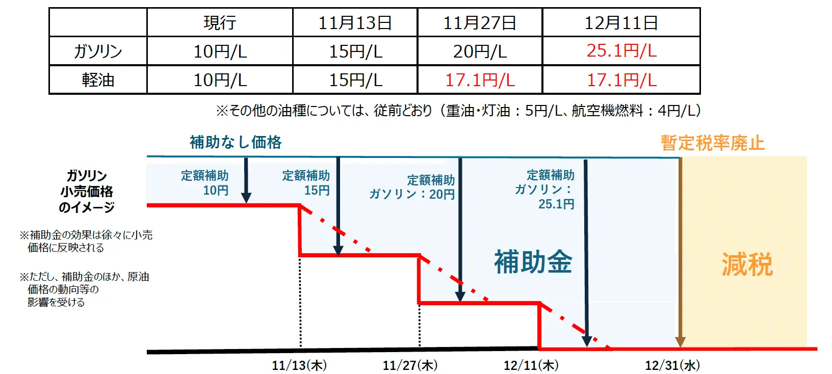 11月13日に現行の補助金10円に5円が増額され、15円の補助金が支給されます。11月27日には20円の補助金が支給され、12月11日には、ガソリンの補助金は暫定税率による上乗せ分と同水準の25.1円になります。