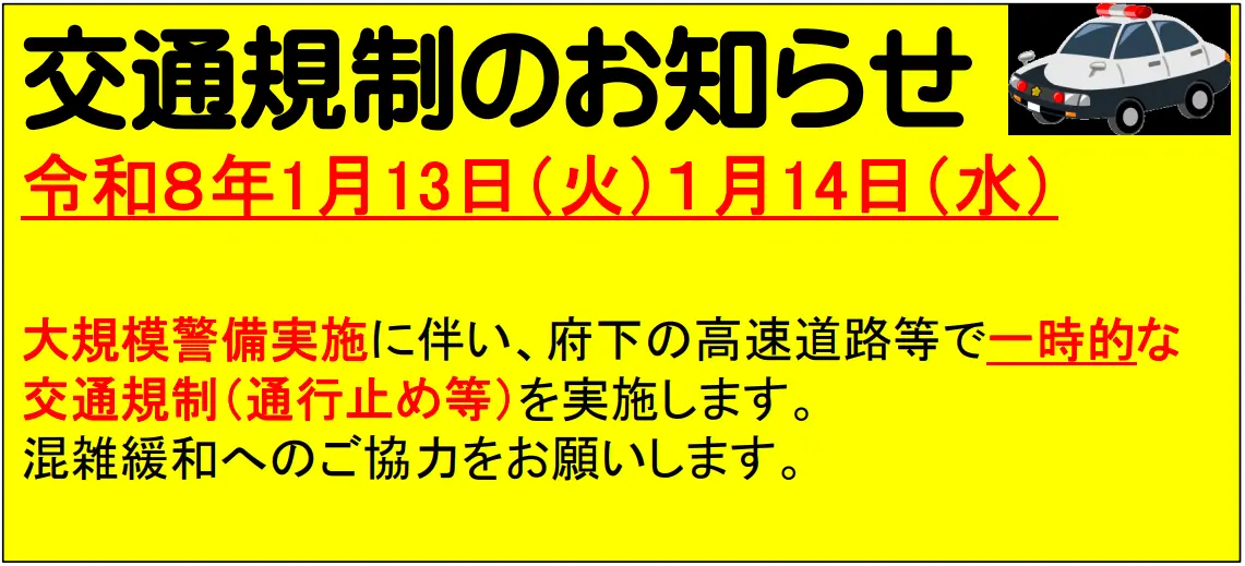 今回の規制について、府警はテロ対策や警備上の安全を確保する目的から、具体的な規制場所や詳細な時間帯については事前に公表していません。規制は一行の移動に合わせて随時行われるため、高速道路だけでなく、接続する一般道においても断続的な渋滞が発生する可能性があります。